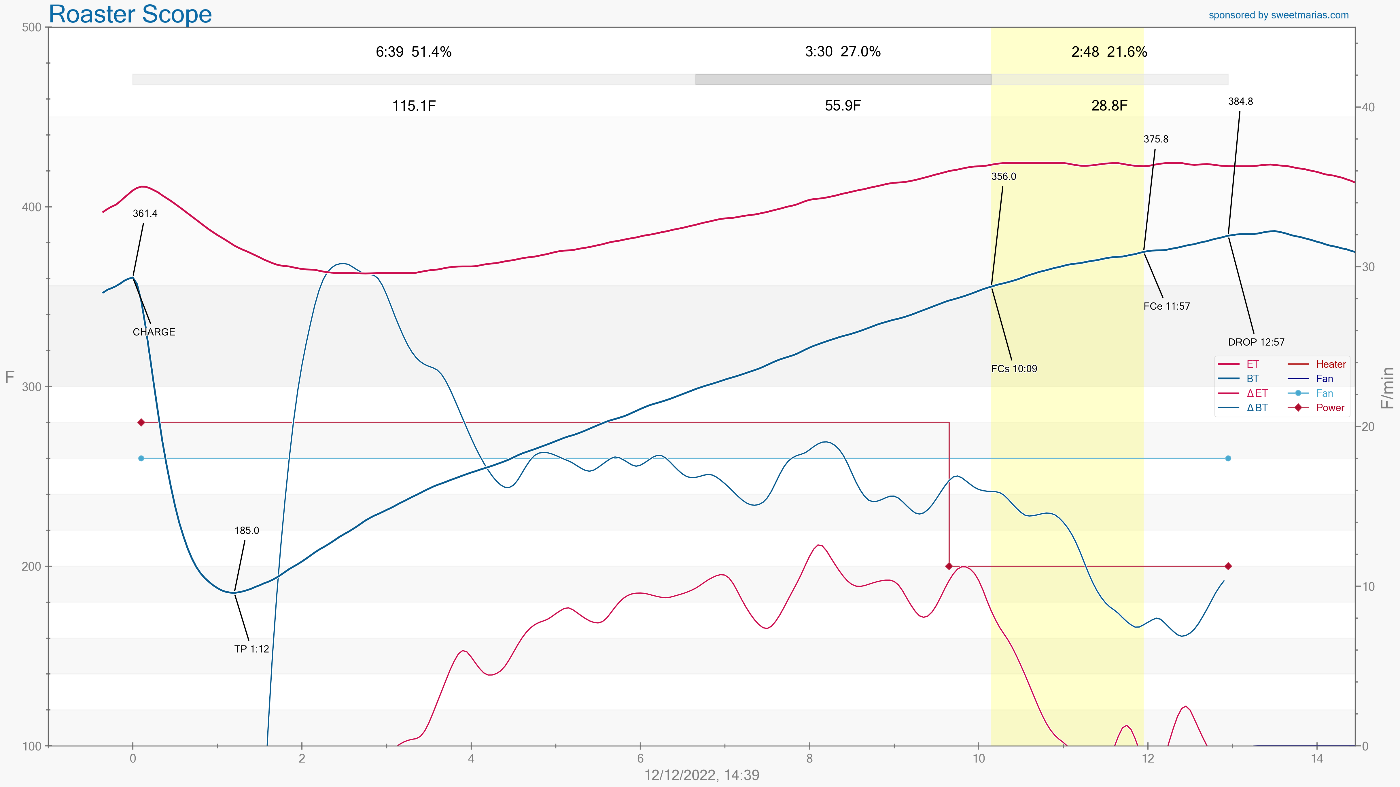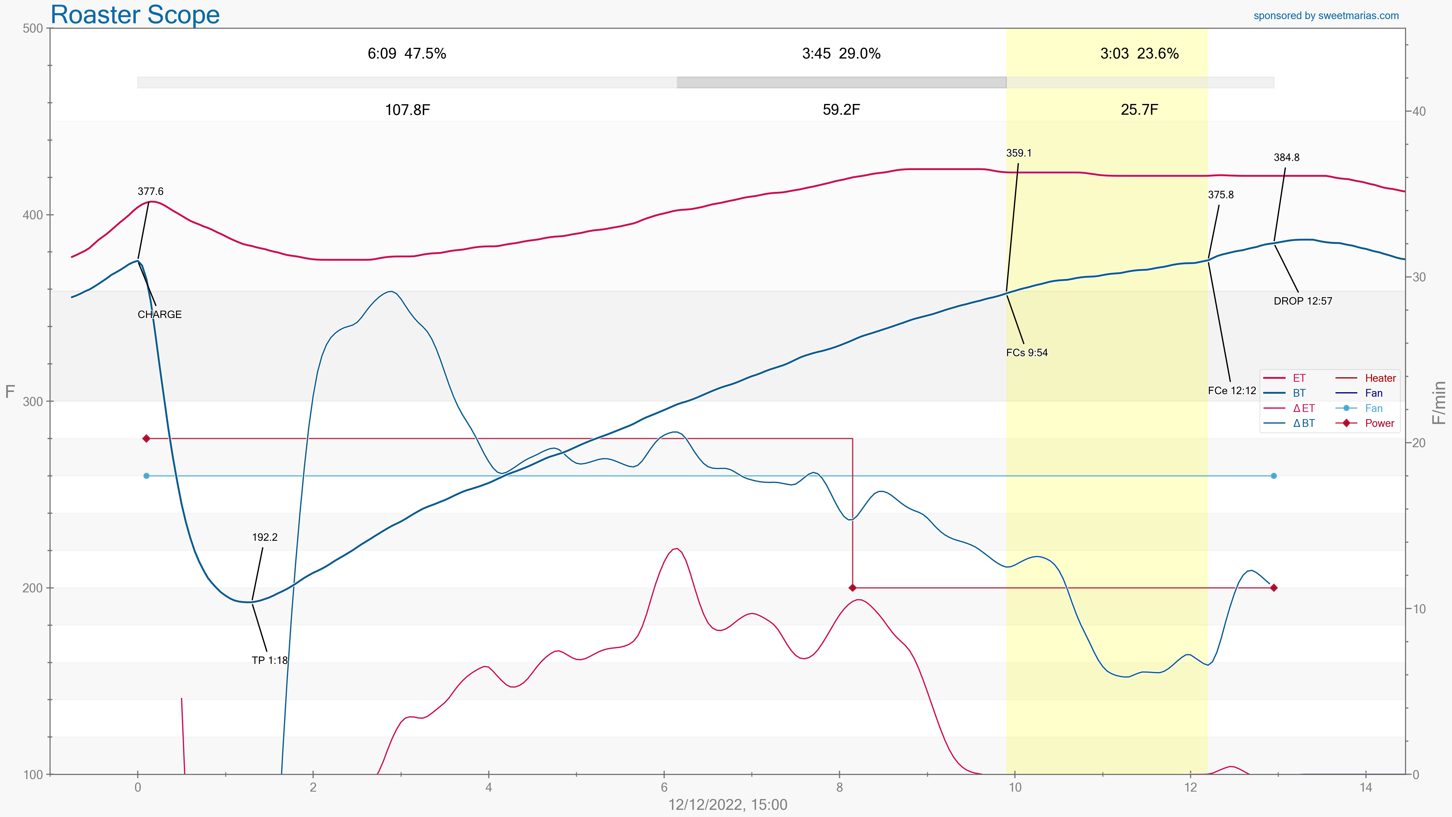 Ambient temp was 52F ~ 55F. Bean temp at drop was 384F.