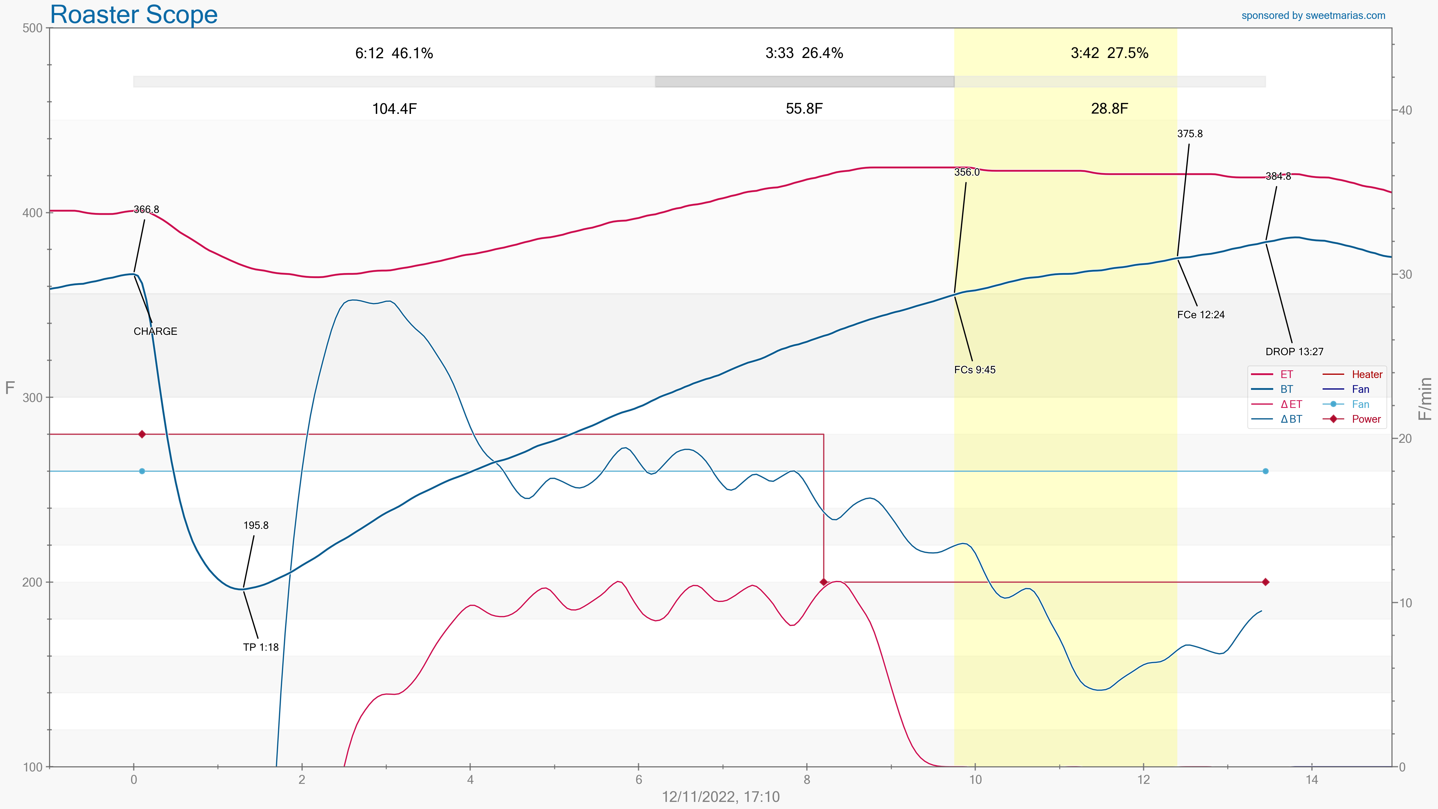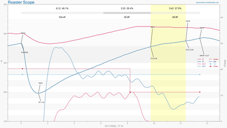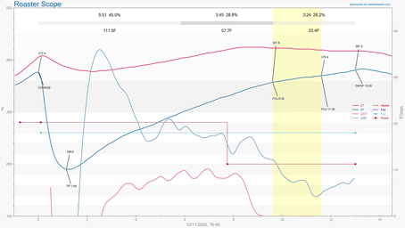 During batch #2, saw some kind of string in the charge, so immediately dropped and reset. Roasted #2 30 seconds longer to get bean temp near 385.