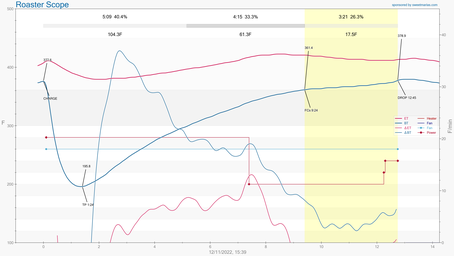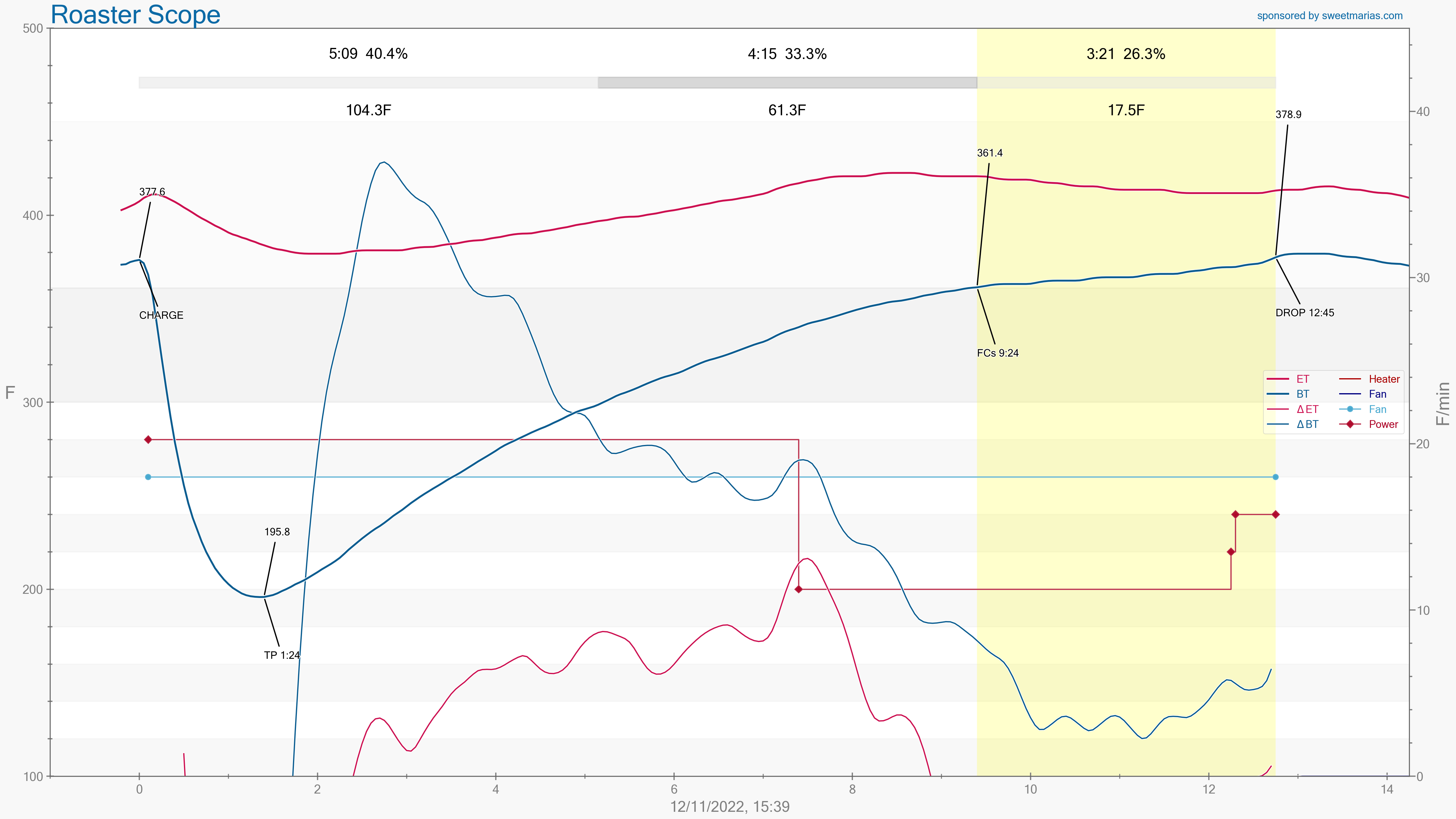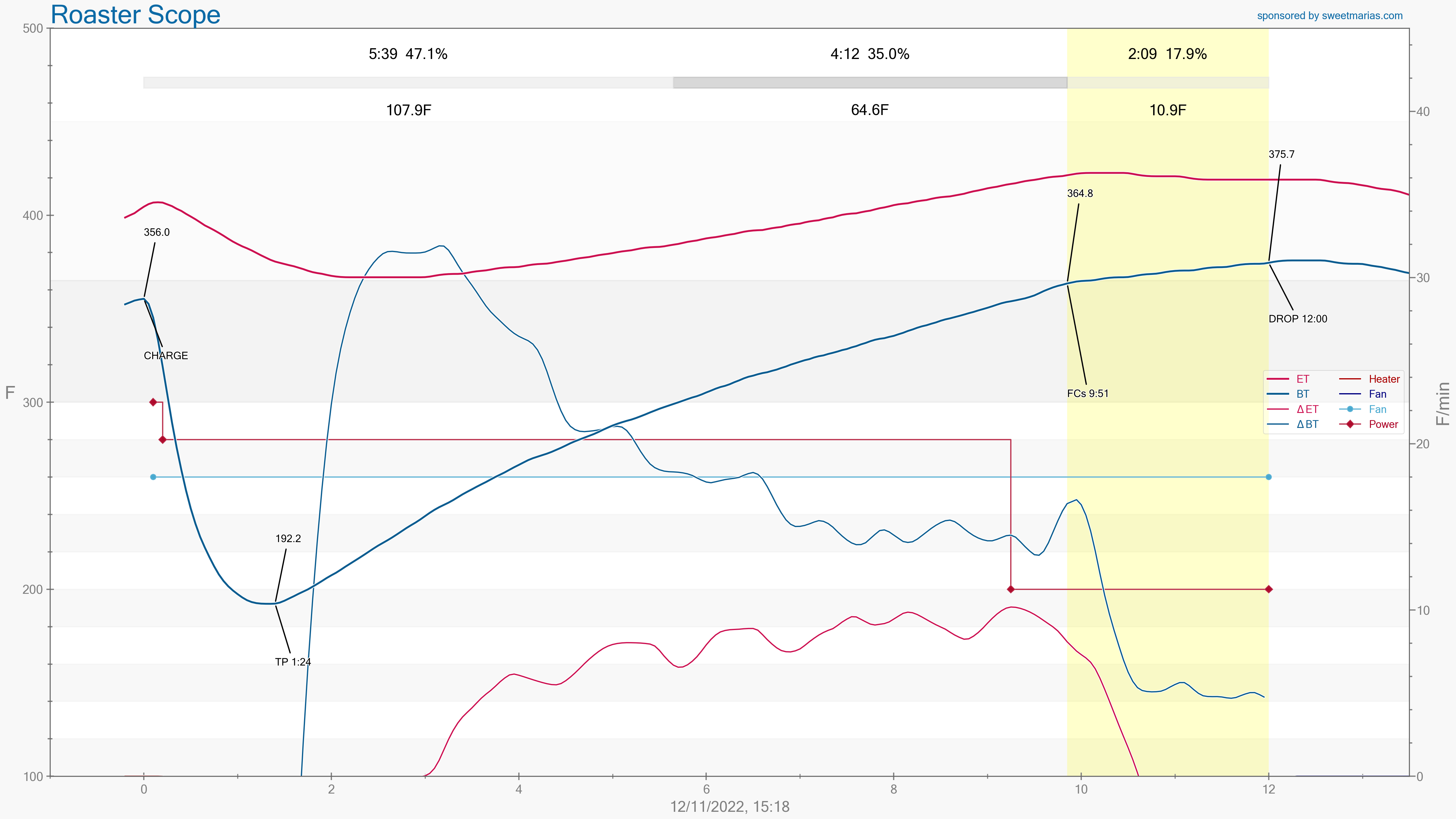 Difficult to tell when first crack started/finished. Not much cracking. Not much chaff. Let batch #2 run to 12:45 to get bean temp over 375F.