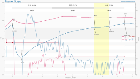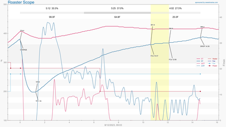 Batch #3: Distracted mid roast. Not sure if first crack start/end times are correct. Maybe I missed it, but first crack did not seem as pronounced for this batch. Sporadic, quiet cracks near the mid/end of the roast.
